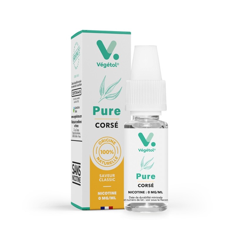 E-liquide végétal naturel français (100% d'origine naturelle), sans propylène glycol, sans glycérine végétale, non allergisant et non irritant. Arôme Corsé (classic). E-liquide très proche de la cigarette classique avec une assimilation rapide de la nicotine. E-liquide 100% Végétol® certifié Origine France Garantie. Base Végétol® certifiée EVE Vegan®.